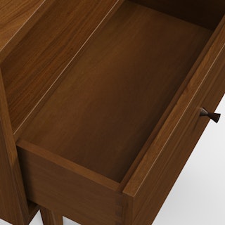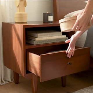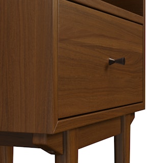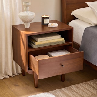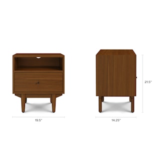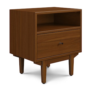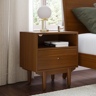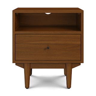 An apartment-friendly nightstand, the Cooper has a small footprint but doesn't lack storage. A spacious soft-close drawer with an open shelf provides ample space, while its cable management cut-out ensures those pesky wires stay hidden. Sleep well, knowing you'll wake up to Cooper's subtle, minimal design in the morning.