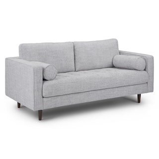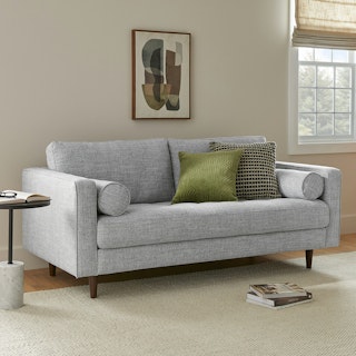 Our most popular sofa, reimagined for apartment living. This modern take on a mid-century classic features clean lines, a tufted benchseat, and luxuriously stuffed back cushions. Two matching round bolsters complete the look.